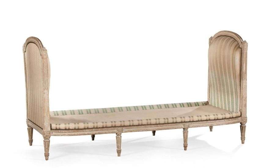 Lit de repos en hêtre mouluré, sculpté et laqué gris| les chevets égaux en anses de panier à pinacles feuillagés| les montants à cannelures rudentées| dés à rosaces| pieds fuselés cannelés à rudents. Estampille de JB Boulard. Epoque Louis XVI (renforts). Garniture de tissu à bandes alternées crèmes et grises. H: 101 - L: 185 - P: 75 cm.