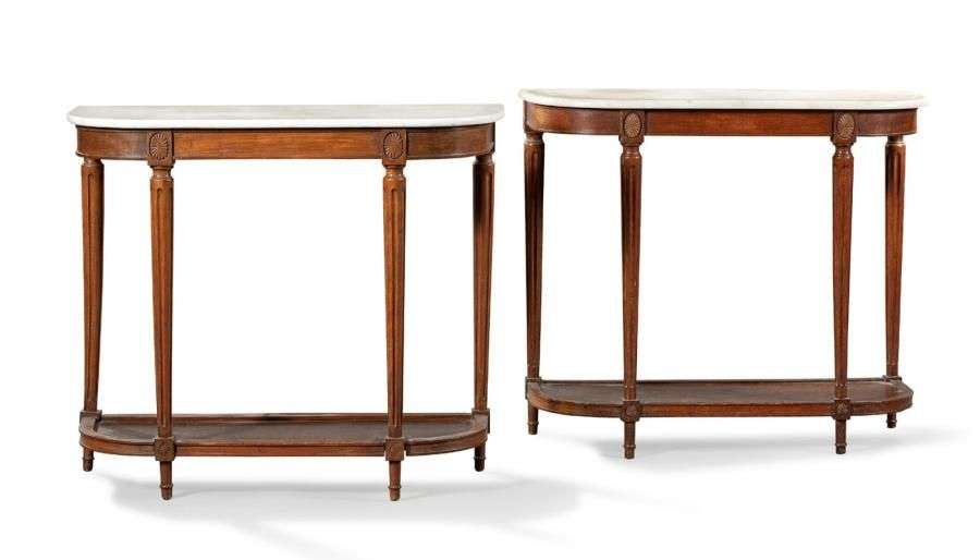 Paire de consoles en hêtre mouluré et sculpté| de forme rectangulaire à côtés arrondis, elles reposent sur des pieds fuselés à cannelures réunis par une tablette. Plateaux de marbre blanc veiné gris. Travail néoclassique. H: 88 - L: 101 - P: 40 cm.