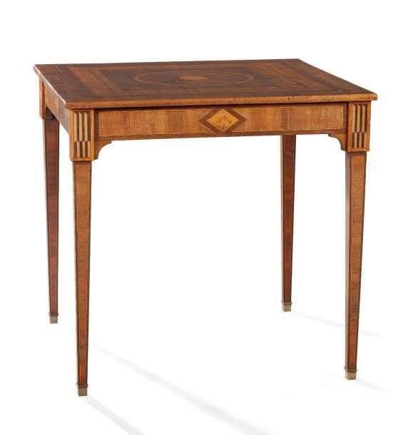 Table de milieu marquetée sur le plateau d'un motif rayonnant à ombilics dans une réserve plaquée d'amarante à encadrements de filets composés et citronnier de fil| les ceintures centrées de losanges paysagés. De forme carrée, elle repose sur des pieds gaines. Travail italien de la fin du XVIIIème siècle (restaurations). Porte une inscription au pinceau 21 et Maria. H: 76 - L: 79 - P: 79 cm.