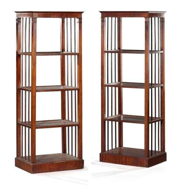 Paire d'étagères-présentoirs à toutes faces en acajou et placage d'acajou| de forme rectangulaire, elles possèdent trois étagères réunissant des côtés à barreaux| montants droits à fines moulures| bases pleines. Epoque Directoire (petits coups et légers manques). H: 142 - L: 50,5 - P: 37 cm.