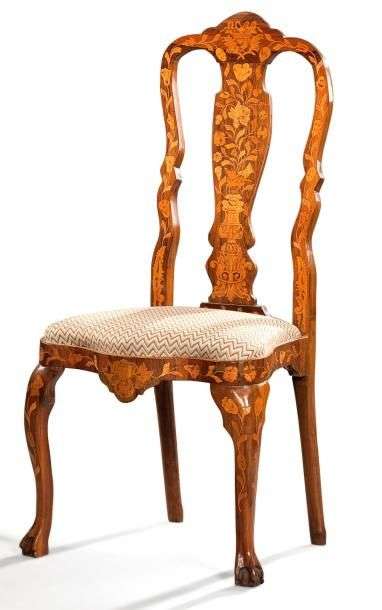 Chaise en hêtre marqueté de branchages fleuris et feuillagés, vases sur entablements, oiseaux, armoiries à porc-épic, sur contre-fond de palissandre| le haut dossier ajouré et chantourné| pieds cambrés se terminant en claw-and-ball. Travail hollandais du XIXème siècle (restauration d'usage). Garniture à placet mobile à tissu imitant le point de Hongrie. H: 112,5 - L: 54 - P: 50 cm.