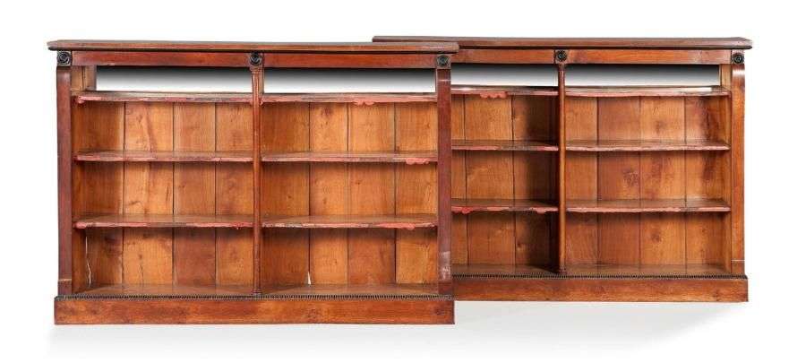 Paire de bibliothèques à hauteur d'appui en cerisier| de forme rectangulaire, elles comportent trois étagères| le rang supérieur foncé de glace (au mercure)| les montants en consoles ou colonnettes. Bases pleines. Elles sont agrémentées de moulures, ombilics et frises de godrons en bois noirci. Première tiers du XIXème siècle. H: 105 - L: 155 - P: 27,5 cm.