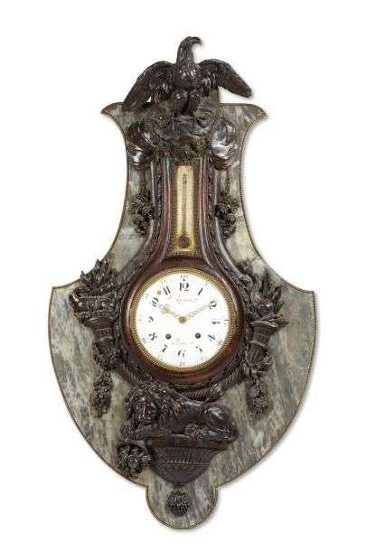 Rare baromètre et thermomètre en bois sculpté-patiné et bronze doré| à l'amortissement un aigle aux ailes déployées| sur les côtés des cornes soutenant pour l'une une salamandre et l'autre un dauphin| le culot à graines et feuilles de laurier comprenant un lion allongé. Le thermomètre à alcool inscrit «selon Réaumur»| le baromètre anciennement remplacé par un mouvement de la même époque dont le cadran, signé «Hoguet à Paris», indique les heures et les minutes en chiffres arabes. Epoque Louis XVI (éclats au cadran| restauration et petits manques). L'ensemble est appuyé sur une plaque de marbre de marbre bleu turquin chantournée et bordée d'un rang de perles en bronze. H: 126 - L: 73 cm.