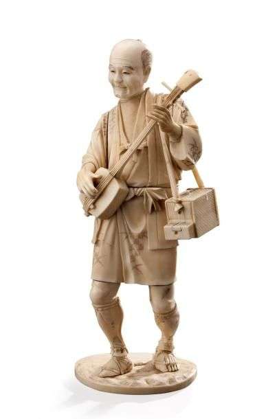 Okimono en ivoire finement sculptée et gravée représentant un musicien ambulant tenant son instrument de musique et portant un coffret sur son épaule gauche. Il repose sur une base circulaire. Travail japonais du XIXème siècle (gerces). H: 26 cm.