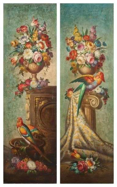 Deux panneaux peints sur toile représentant des entablements recevant des vases chargés de fleurs et animés de perroquets. Dimensions d'un panneau: H: 158 - L: 51 cm.