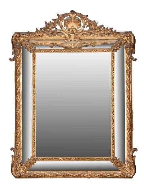 Miroir rectangulaire à profil inversé en bois et stuc doré à décor d'un fronton ajouré à feuillages et coquilles| le double encadrement à baguettes de perles et tores agrémentées de feuilles d'acanthe. XIXème siècle (quelques éclats et manques). H: 120 - L: 91 cm.