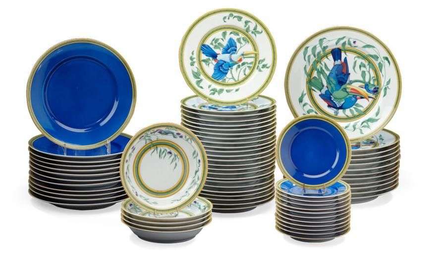 Service porcelaine Hermès Modèle Toucan: - 5 assiettes creuses - 24 assiettes moyennes - 12 grandes assiettes - 12 petites assiettes bleues - 11 grandes assiettes bleues