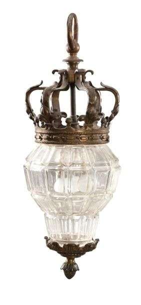 Lanterne en verre moulé-taillé et bronze ciselé| elle est suspendue par un large anneau rattaché à une couronne fleurdelisée| culot feuillagé à pomme de pin. Seconde moitié du XIXème siècle. H: 63 cm.