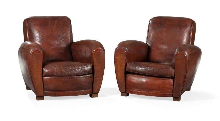 Paire de fauteuils dits «club» en cuir patiné. Milieu du XXème siècle. H: 85 - L: 93 - P: 102 cm.