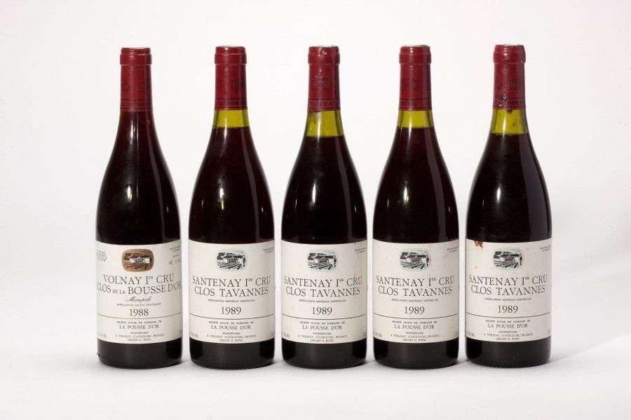 4 B SANTENAY CLOS DE TAVANNES (1er Cru) e.l.s| 2 capsules légèrement gonflées Domaine de la Pousse d'Or 1989| 1 B VOLNAY CLOS DE LA BOUSSE D'OR (1er Cru) Domaine de la Pousse d'Or 1988