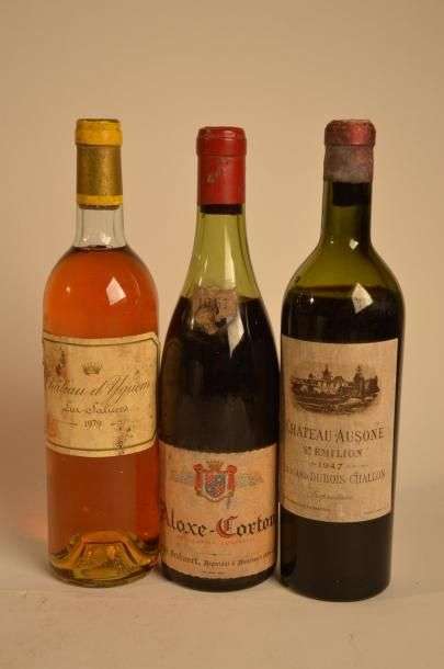 1 B CHÂTEAU D'YQUEM (T.L.B| e.t.h| c.s.) C1 Supérieur Sauternes 1979| 1 B CHÂTEAU AUSONE (Belle vidange| e.t.h. + 1 accroc| capsule courte légèrement abimée) GCC1A St Emilion 1947|1 B ALOXE CORTON (5,5| e.t.h| clm.a.) Marcel Frécourt Nég. 1967