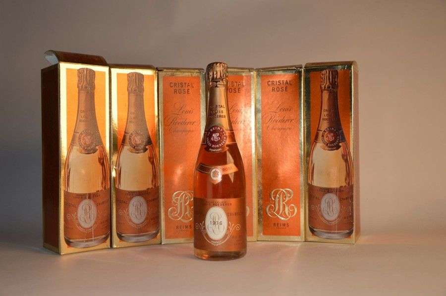 6 B CHAMPAGNE CRISTAL Rosé (étuis individuels sales) e.l.s| coiffes légèrement corrodées sinon belles Roederer 1976