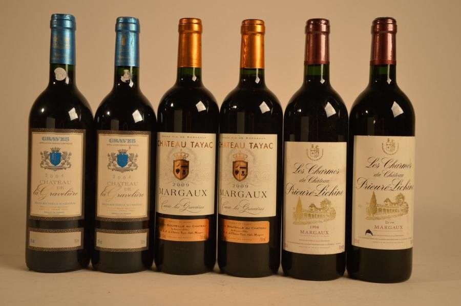 2 B LES CHARMES DU CHÂTEAU PRIEURE LICHINE (1 e.t.h| 1 e.a. avec millésime partiellement lisible) Margaux 1998| 2 B CHÂTEAU TAYAC CUVEE LES GRAVIERES Margaux 2009| 2 B CHÂTEAU DE LA GRAVELIERE CUVEE PRESTIGE Rouge Graves 2004