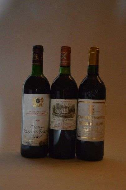 1 B CHÂTEAU PICHON COMTESSE DE LALANDE (e.t.h. légère) GCC2 Pauillac 1993|1 B CHÂTEAU BEAU SEJOUR BECOT (H.E| e.t.h| capsule légèrement gondolée et abimée au sommet) GCC1B St Emilion 1990, 1 B CHÂTEAU SAINT PIERRE (B.G.+| accrocs légers étiquette) GCC4 St Julien 1982