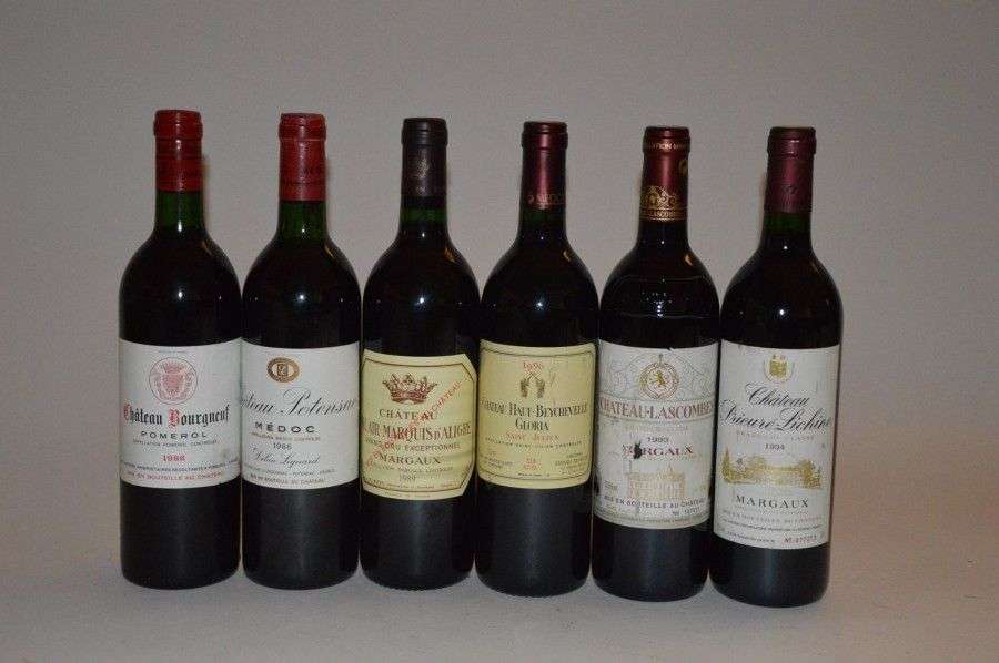 1 B CHÂTEAU BEL AIR MARQUIS D'ALIGRE (e.f.s. légère) Margaux 1989| 1 B CHÂTEAU PRIEURE LICHINE GCC4 Margaux 1994| 1 B CHÂTEAU LASCOMBES (e.a.) GCC2 Margaux 1993| 1 B CHÂTEAU POTENSAC (T.L.B.) Médoc 1986| 1 B CHÂTEAU HAUT BEYCHEVELLE GLORIA (quelques marques étiquette) Saint Julien 1986| 1 B CHÂTEAU BOURGNEUF (e.l.s.) Pomerol 1986