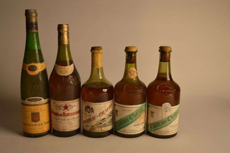 1 B CHÂTEAU CHALON (H.E.+| e.t.h| c.s. légèrement couleuse) Courbet 1973| 1 B CHÂTEAU CHALON (e.t.h. à e.l.a| années 70) Courbet?| 1 B CHÂTEAU CHALON (B| e.t.h| s.c.m.) Michel Tissot?,1 B L'ETOILE Blanc (4,5| e.t.h.) Jean Gros 1984, 1 B GEWURZTRAMINER VT (4,5| e.t.h| c.s.) Hugel 1976