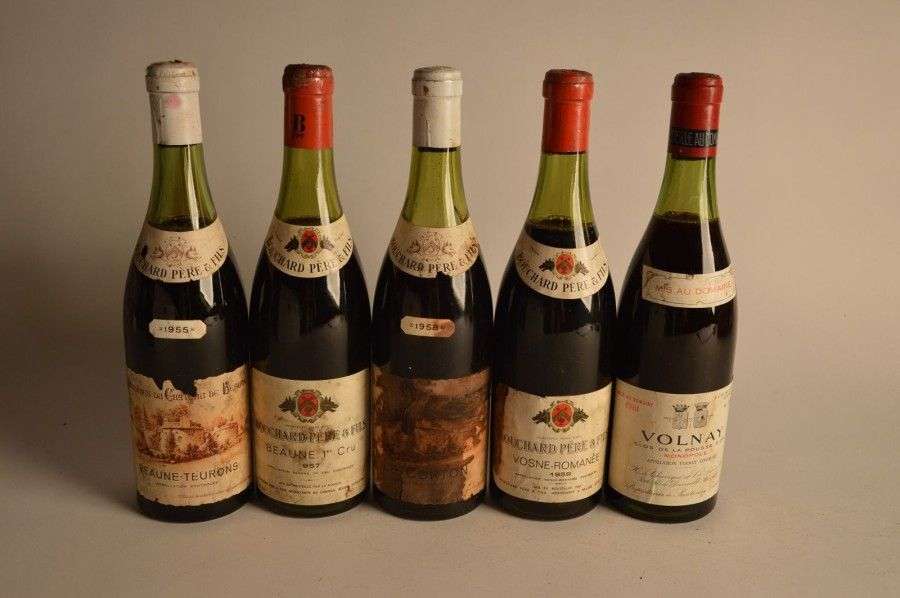 1 B CORTON LE CORTON (Grand Cru) 5,5| e.a| clm. tachée Bouchard P&F 1958, 1 B VOLNAY CLOS DE LA POUSSE D'OR (1er Cru) 4| e.t.h| c.a. sommet| légèrement couleuse Chavigné & Lavoreille 1961| 1 B VOSNE ROMANEE (4,3| e.l.a| c.a. sommet) Bouchard P&F 1959| 1 B BEAUNE TEURONS (1er Cru) 4,7| e.a| c.a. sommet Bouchard P&F 1955|1 B BEAUNE (1er Cru) 4,7| e.t.h| c.a. sommet Bouchard P&F 1957