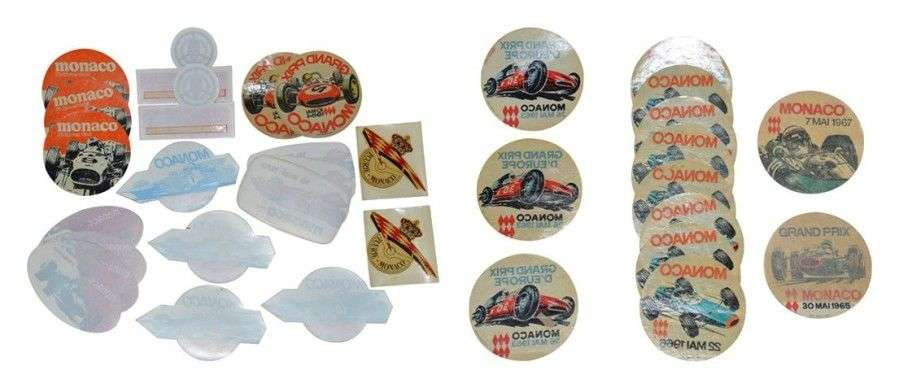 Lot de 35 stickers environ, comprenant: Grand Prix de Monaco 1964, 1965, 1966, 1967, 1968, 1969, 1970, 1971, Grand Prix d'Europe 1963, Association internationale des anciens pilotes du rallye de Monte-Carlo Ecurie-Monaco