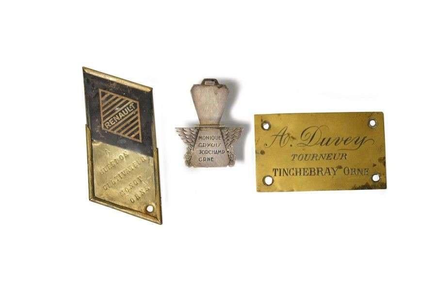 Lot de 3 plaques de tableau de bord avec le nom des proprétaires dont une au logo de RENAULT