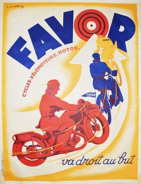 Affiche Cycles Favor cycles, vélomoteurs, moto, signée Matthey, pliures et