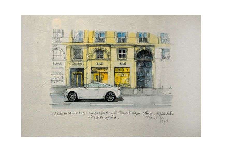 Le Nuvolari Quattro quitte l'espace Audi pour sillonner les plus belles artères de la capitale" Estampe en couleurs numérotée 46/230, réalisée pour Audi 43 x 63 cm