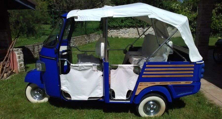 APE CALESSINO ÉDITION LIMITÉE Lancée en 1948 sur la base d'un scooter Vespa, avec sa benne de chargement, le Piaggio APE était surtout un utilitaire, dont la version destinée au transports de personnes est arrivée en 1949 sous l'appellation d'APE Calessino. Depuis ce petit tripode n'a cessé d'exister. Le Piaggio APE Calessino a d'ailleurs révolutionné la façon de se déplacer dans les vieux centres historiques des villes méditerranéennes. C'est un véhicule pour deux passagers et un conducteur avec une structure ouverte et un toit décapotable. Le Piaggio APE Calessino que nous présentons est une édition limitée du tripode Piaggio APE. Il a été produit par Piaggio en collaboration avec le manufacturier italien de moteurs diesels Lombardini. 999 exemplaires de couleur bleue comme le notre ont été fabriqués entre 2007 et 2009. Deux autres séries limitées ont suivi: la même mais de couleur blanche et une version électrique. L'exemplaire proposé, le numéro 85 de la série est en parfait état, vu son très faible kilométrage il est même quasiment neuf. Sa présentation qui fait la caractéristique de sa série limitée est très seyante: le bleu de sa carrosserie est associé à des portes et une capote en tissu imperméable de couleur blanche, le tout monté sur des châssis tubulaires en acier inoxydable poli et assorti à des pneus à flancs blanc du plus bel effet. L'intérieur est lui aussi de couleur blanche, en simili. Avec son moteur diesel à 4 vitesses, il est l'outil idéal des balades, dans une ambiance extraordinaire et hors du temps. Based on a Vespa Scooter, the APE was launched in 1948 with a small rear dump, named Calessino for people transportation. It has three seats, an opening structure and a hood. Our Pisaggio APE Calessino is a limited edition of the three-wheels and is equipped with a diesel Lombardini 422cc engine. It is one of the 999 example made in blue between 2007 and 2009. Our example, the number 85 of the collection, is in perfect state of work and is almost