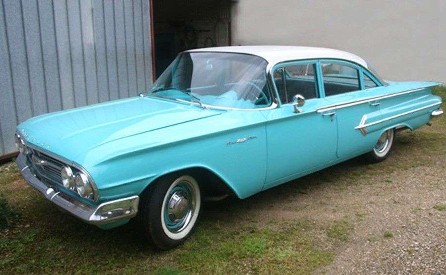 BEL AIR Aux Etats-Unis, les années 50's marquent une véritable révolution stylistique d'un point de vue automobile. Fabuleux succès de la marque Chevrolet qui appartient déjà depuis longtemps au groupe General Motors, la Bel Air est lancée au début des années 50. Elle hérite du nom d'un quartier select de la ville de Los Angeles. Elle fut produite de 1951 à 1975 à travers cinq générations différentes. Cette voiture était dédiée au marché américain dans son ensemble offrant un excellent compromis qualité/prix. Le succès tiendra aussi dans la déclinaison du nombre de carrosseries et de motorisations possibles permettant à chacun de trouver le modèle adéquat. Le succès de ce modèle sera particulièrement fort entre 1955 et 1957, que l'on appelle aujourd'hui les « Tri-Chevy ». En 1959, la gamme Chevrolet est intégralement revue: l'Impala remplace la Bel Air dans le segment du haut de Gamme, la Bel air devient une finition intermédiaire, avec des motorisations allant du 6 cylindres en ligne au gros V8 de 5.7L. La véritable surprise vient du changement radical dans le design: elles arborent les fameuses « ailes de mouettes » si caractéristiques. La gamme Chevrolet sera sur ces deux années un véritable best-seller, et sa cote d'amour demeure intacte, en France comme aux Etats-Unis. Le modèle que nous vous présentons est une très jolie Bel Air Four-doors Sedan. Elle fut importée en France en 2010 ayant précédemment bénéficié d'une restauration intégrale et d'un bon niveau aux Etats-Unis. Sa très belle robe bi-ton Tropical Turquoise et Ermine White est récente et lui sied à merveille, reflétant parfaitement les teintes des années 1950. Le châssis et la caisse sont extrêmement sains. Son moteur est un V8 283ci de 4.7 litres de cylindrées, qui n'est pas son bloc d'origine mais le même qui était disponible au catalogue de l'époque. L'intérieur est digne de son apparence, de très bonne qualité, et sa sellerie en velours bleu est particulièrement accueillante. En plus d'une restau