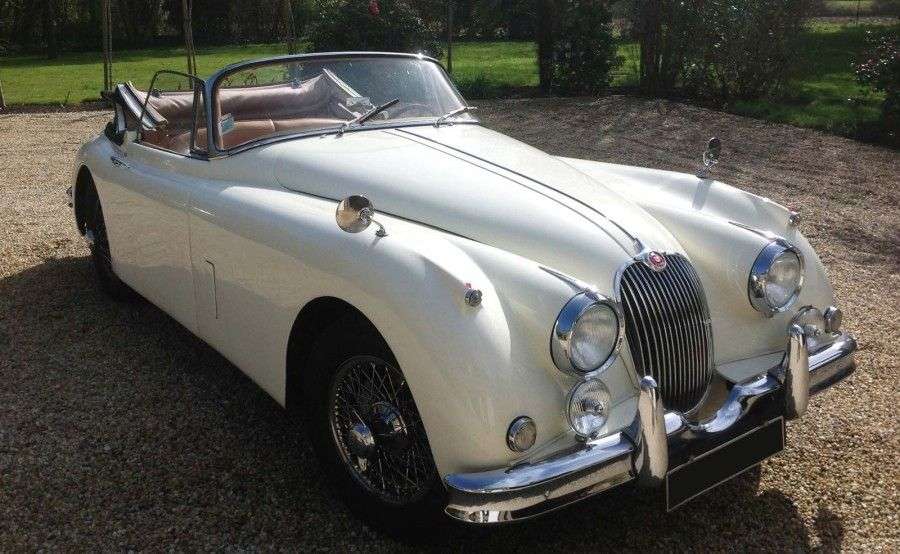 XK 150 CABRIOLET Ultime évolution de la série des XK, c'est en mai 1957 que Jaguar lance la 150 succédant ainsi à la 120 de 1948 et la 140 de 1954. Elle est une évolution douce mais importante de ses aînées. Lancée d'abord en coupé et en cabriolet, la 150 voit arriver un roadster en 1958. Esthétiquement les évolutions consistent d'abord en l'adjonction d'un pare-brise bombé d'un seul tenant tout comme la vitre arrière sur le coupé. Techniquement, la 150 conserve l'architecture du châssis dont la suspension avant à barres de torsion longitudinales et l'essieu arrière rigide monté sur lames semi-elliptiques. Elle hérite aussi de la direction à crémaillère et bénéficie et c'est une première, de freins à disque de série. Le moteur est le 3,4 litres de 190 chevaux et une culasse spéciale permet de monter à 210 chevaux. Il est accouplé une boîte manuelle à 4 rapports complétée en option d'un overdrive ou une Borg Warner automatique à trois rapports. Dès l'année suivante, une version S du moteur 3,4 litres est lancée avec trois carburateurs SU HD8 permettant de développer 250 ch. Fin 1959, les moteurs 3.4 l sont toujours proposés mais Jaguar présente un tout nouveau moteur de 3.8 l de 220 ch ou 265 ch dans sa variante S. C'est au total 9 382 exemplaires de la XK 150 qui auront été produits, en grande majorité pour être exportés aux Etats-Unis. La XK 150 laissera sa place à ce qui va devenir un autre mythe de l'Automobile, la Jaguar type E. La voiture présentée est un magnifique Drop Head Coupe 150 de 1959. D'origine californienne, son moteur est le 6 cylindres de 3.4 litres de cylindrée. Il s'agirait d'ailleurs de son bloc d'origine. Achetée en 2009 par son actuelle propriétaire, la voiture a ensuite été totalement restaurée sur 3 ans de 2011 à 2013. Elle se présente dans un superbe état général. Sa robe Old English White se marrie parfaitement avec un magnifique intérieur en cuir, de couleur biscuit. Sa capote doublée est en alpaga noir et le tout est rehaussé de roues fi