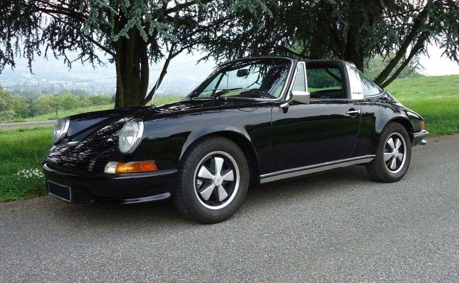911 T 2.4L TARGA La première version de ce mythe automobile absolu, alors appelée 901, a été présentée en 1963 lors du Salon de l'automobile de Francfort. Rebaptisée 911, elle sort avec un moteur 2 litres puis adoptera une cylindrée de 2.2 litres en 1970. Enfin et toujours soucieux de répondre aux impératifs du marché américain, le principal pour la 911, Porsche propose la 2,4 L en 1972. Cette nouvelle cylindrée de 2341 cm3 est obtenue par un allongement de la course de 66 à 70,4 mm. Les 911 2,4 litres sont elles aussi déclinées en version T, E et S qui disposent respectivement de 130, 165 et 190 chevaux. La T est la seule à conserver deux carburateurs Zenith à triple corps mais gagne 5 chevaux par rapport à sa devancière, les autres modèles conservant l'injection mécanique. Afin d'améliorer la tenue de route, Porsche procède au réaménagement de quelques organes périphériques du moteur, comme le réservoir d'huile qui est déplacé devant l'essieu arrière. Cela explique l'apparition d'une seconde petite trappe de remplissage située dans l'aile arrière droite. Pour l'anecdote, il est à noter que Porsche modifiera cette trappe car bon nombre de pompistes firent « le plein » au mauvais endroit et elle n'apparaitra donc qu'en 1972. La T est équipée de série d'une boite manuelle 915 à 4 rapports avec une grille en H mais elle peut recevoir en option une boite à 5 rapports ou la Sportomatic à 4 rapports. La grille du capot moteur est noire et porte un logo 2.4. C'est la 2.7 L qui lui succèdera, présentée en 1973. La voiture présentée est une séduisante 911 Targa 2,4 T. Livrée neuve en France au mois de Décembre 1972 en Avignon, elle fut immatriculée pour la première fois en janvier 1973. Ce Targa appartient à son propriétaire depuis 1978, soit près de 37 ans, preuve de la stabilité de son historique sur ces dernières décennies. De couleur ivoire clair à l'origine, cette 911 fut restaurée il y a quelques années, et reçu à cette époque une peinture noire et un bouclier avant d