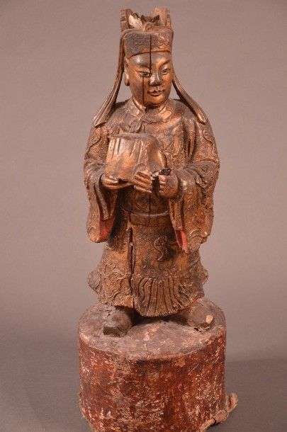 Statuette représentant un dignitaire en bois sculpté laqué rouge et or tenant dans ses mains un présent XIXème siècle H: 61 cm (accident au niveau des mains)