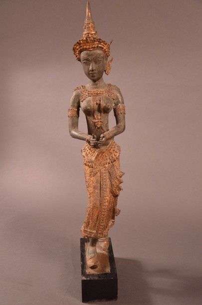 Figurine en bronze laqué or et patiné vert représentant une femme faisant le geste de l'offrande XXème siècle H: 78 cm