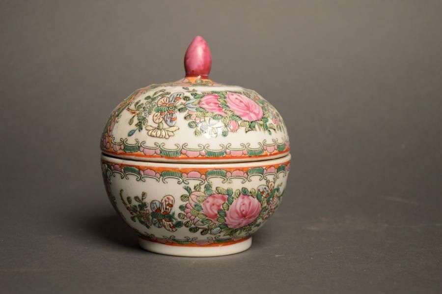 Pot couvert en porcelaine dans le goût de la famille rose Marque apocryphe XXème siècle H: 13 cm