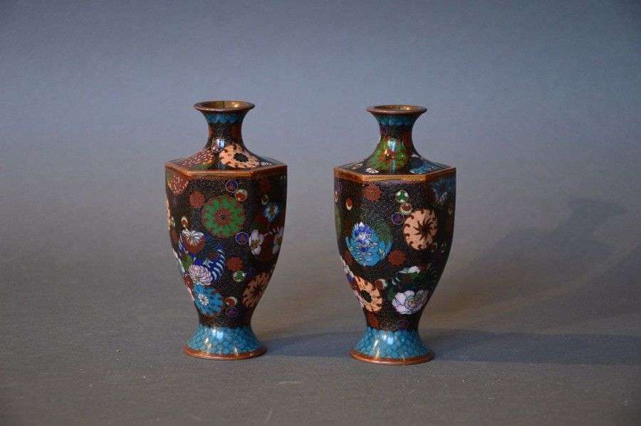 Paire de petits vases balustres hexagonaux en cuivre et bronze cloisonnés à décor polychrome de mons Début XXème siècle H: 13,5 cm