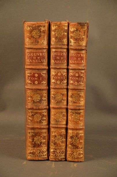 Oeuvres... avec des remarques historiques et critiques de Mr le Duchat. Amsterdam, Jean-Frédéric Bernard, 1741. 3 volumes in-4| veau marbré, dos à nerfs orné. Double filet sur les coupes. La plus belle des éditions de Rabelais au XVIIIe siècle, orné à chaque tome d'un très beau titre gravé par Picard et illustré d'un frontispice à chaque, dessiné et gravé par Folkema, portrait de l'auteur par Tanjé, 12 figures par Du Bourg, 3 gravures typographiques et une carte dépliante, une figure gravée de la Bouteille, 12 vignettes et 12 culs-de-lampe. (Cohen 840). Mors frottés en partie fendus. Coins et coiffes émoussés avec petits manques.