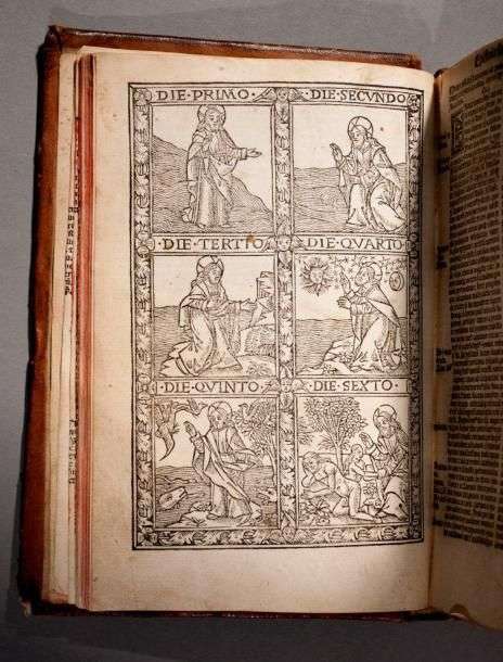 Biblia [cum summariorum apparatu pleno quadruplicique repertorio insignata]. Lyon, Jacobi Saconi, 1500 [1515]. 1 vol. in-8. Basane XVIIIe, pièce de titre de maroquin rouge, dos à nerfs orné, ex-libris frappé en lettres dorées sur le premier plat, L'Abbé Moreau de Coutances. Accidents aux coiffes. 27 ff. sur 28 ff., 499 ff. sur 500, 51 ff. sur 52. > 1 grand bois, lettrines. Ex-libris Jacques Sellier. À la fin de l'Apocalypse on peut lire « Explicit Biblia?| Lugduni, in officina Jacobi Saconi, anno Domini decimo quinto supra millesimum, duodecimo kalendas octobris. » L'oubli dans cette mention du mot quingentesimo après le mot Domini a fait dater cette Bible par plusieurs bibliographes en 1500 au lieu de 1515. (cf. Bibliothèque de l'École des Chartes, année 1894, n° 55, p. 233, « Une prétendue Bible lyonnaise de l'année 1500. »| Bibles imprimées, Delaveau, Hillard, 782.)
