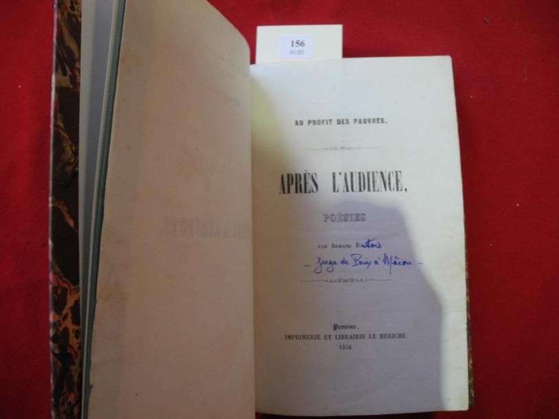 Après l'audience, poésies. Provins, le Heriche, 1856. 1 vol. in-8. Demi-chagrin brun moderne, dos à nerfs, couvertures conservées. Reliure moderne. Armand Putois fut juge de paix à Mâcon.