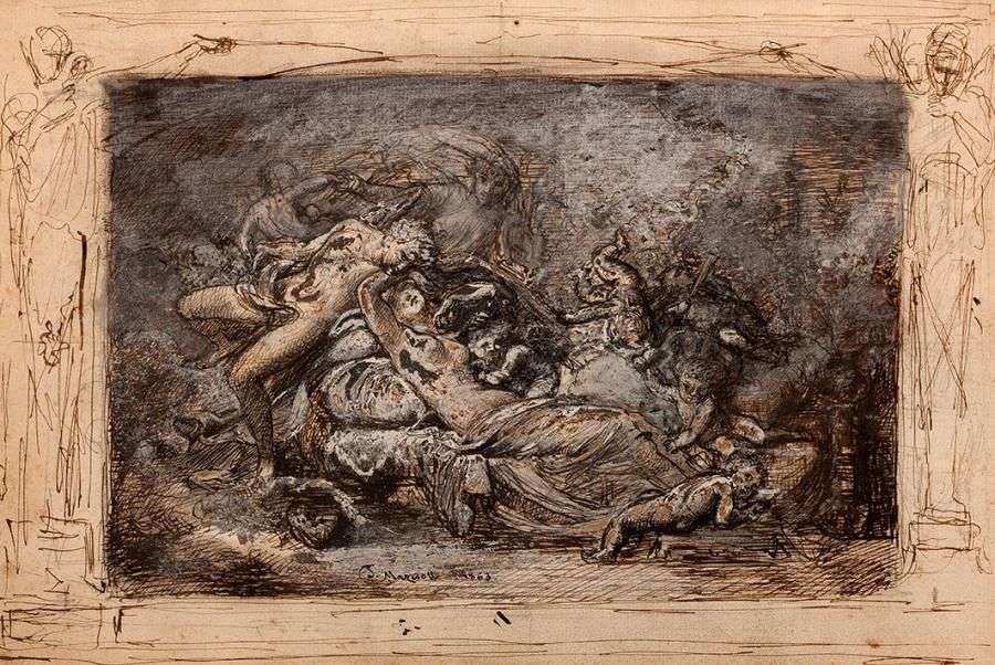 Projet de décor: Bacchus et Ariane endormie avec la muse Erato derrière eux Plume, encre brune et lavis bleu avec rehauts de blanc. H. 19 cm| L. 28,5 cm. Les rehauts de blanc sont légèrment oxydés. Signée et datée en bas: "J. Mazerolle.1863.". expert: Madame Angélique Franck-Niclot