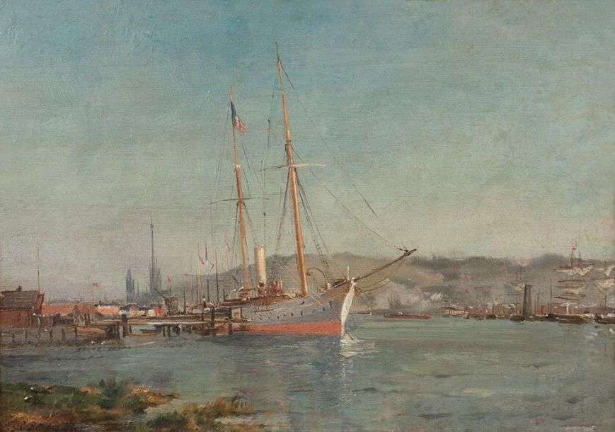 Bateau à quai, Huile sur panneau, portant une signature et une date 1875 en bas à gauche 26 x 35 cm