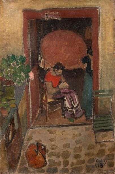 Scène d'intérieur, 1913 Huile sur toile, signée et datée en bas à droite 40 x 27 cm Accidents Provenance: porte au dos une ancienne étiquette de vente du 17 février 1972 de l'étude de Maître Loudmer (N°21?)