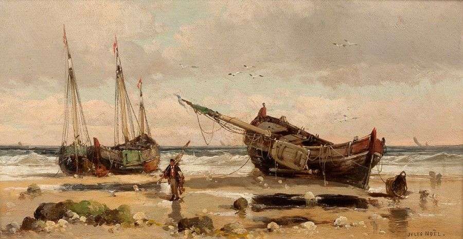 Bateaux à marée basse Huile sur panneau, signée en bas à droite 22 x 40 cm