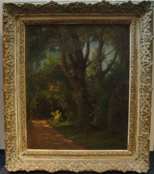 Chemin boisé Huile sur toile, signée en bas à droite 73 x 59 cm Restaurations anciennes