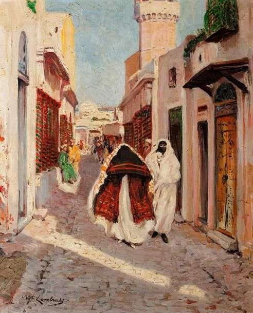 Scène de rue à Tunis, 1909 Huile sur toile, signée et datée en bas à gauche 55 x 46 cm