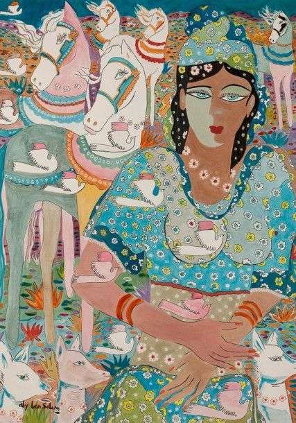 Femme entourée de chevaux et d'oiseaux Technique mixte sur papier, signée en bas à gauche 69 x 49 cm à vue