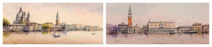 Vue della riva degli schiavoni à Venise Vue depuis la punta della dogana à Venise Paire d'aquarelles, signées et datées en bas à gauche 11.5 x 28.5 cm à vue