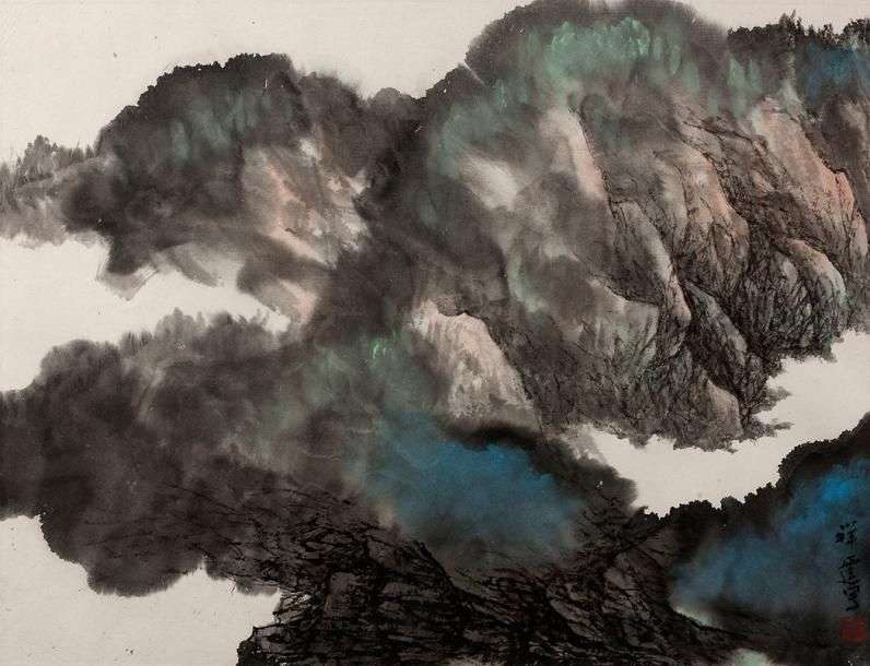 Paysage de montagne Encre et couleurs sur papier monté sur soie, signé et scellé en bas à droite 34.5 x 46 cm