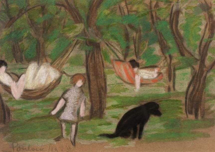 La sieste dans les hamacs Pastel et fusain sur papier, traces de signature et de date en bas à gauche 26 cm x 18,5 cm à vue