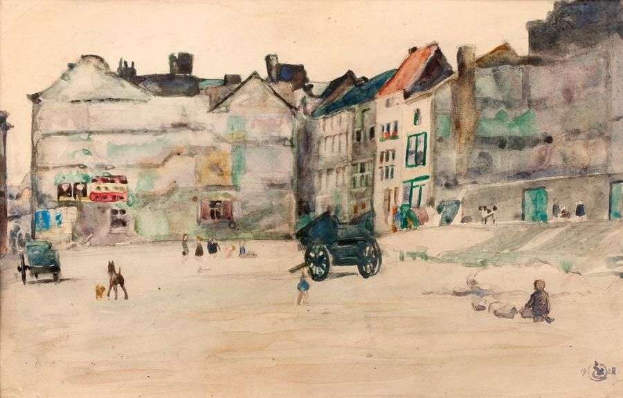 Place de village, 1928 Aquarelle, monogrammée et datée en bas à droite 30 x 46.5 cm à vue