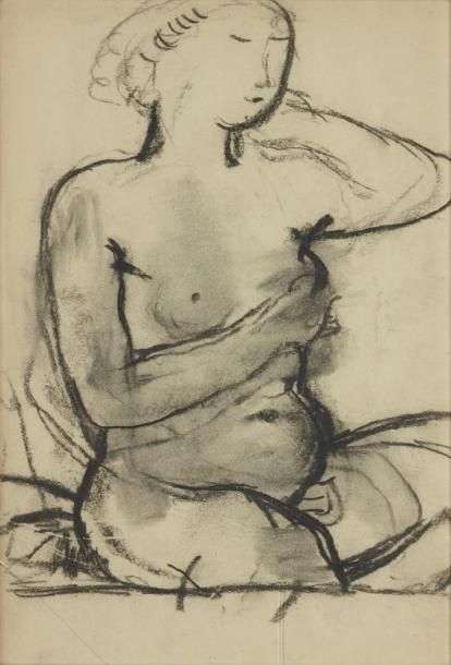 Nu assis Dessin au fusain, au verso une étude de visage de femme. Marqué du cachet Paul Delvaux, carnet n°10, page 20