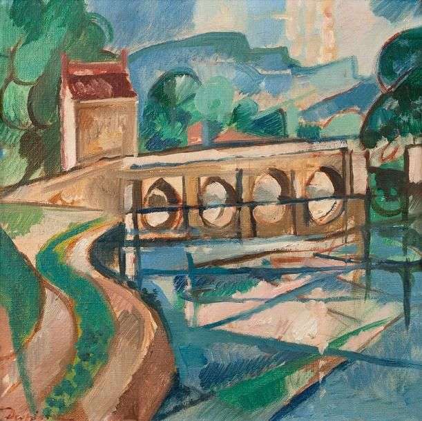 Pont à Mantes Huile sur toile, signée en bas à gauche 25.5 x 25.5 cm