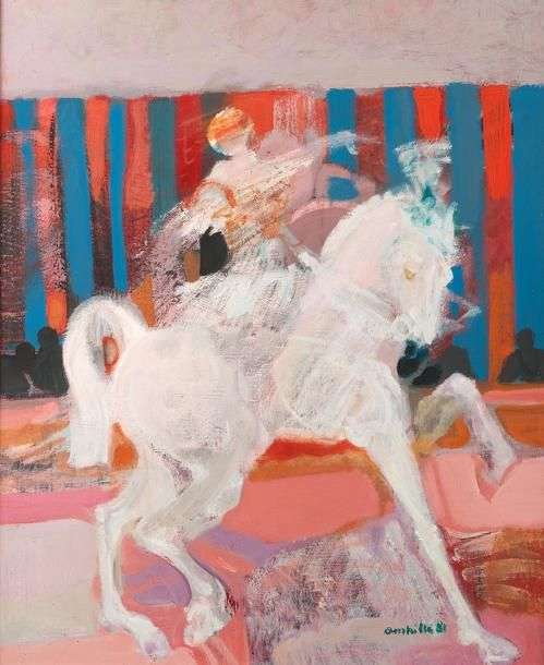 Guitare au cirque Huile sur toile, signée et datée 81 en bas à droite, signée et titrée au dos 65 x 54 cm (*)